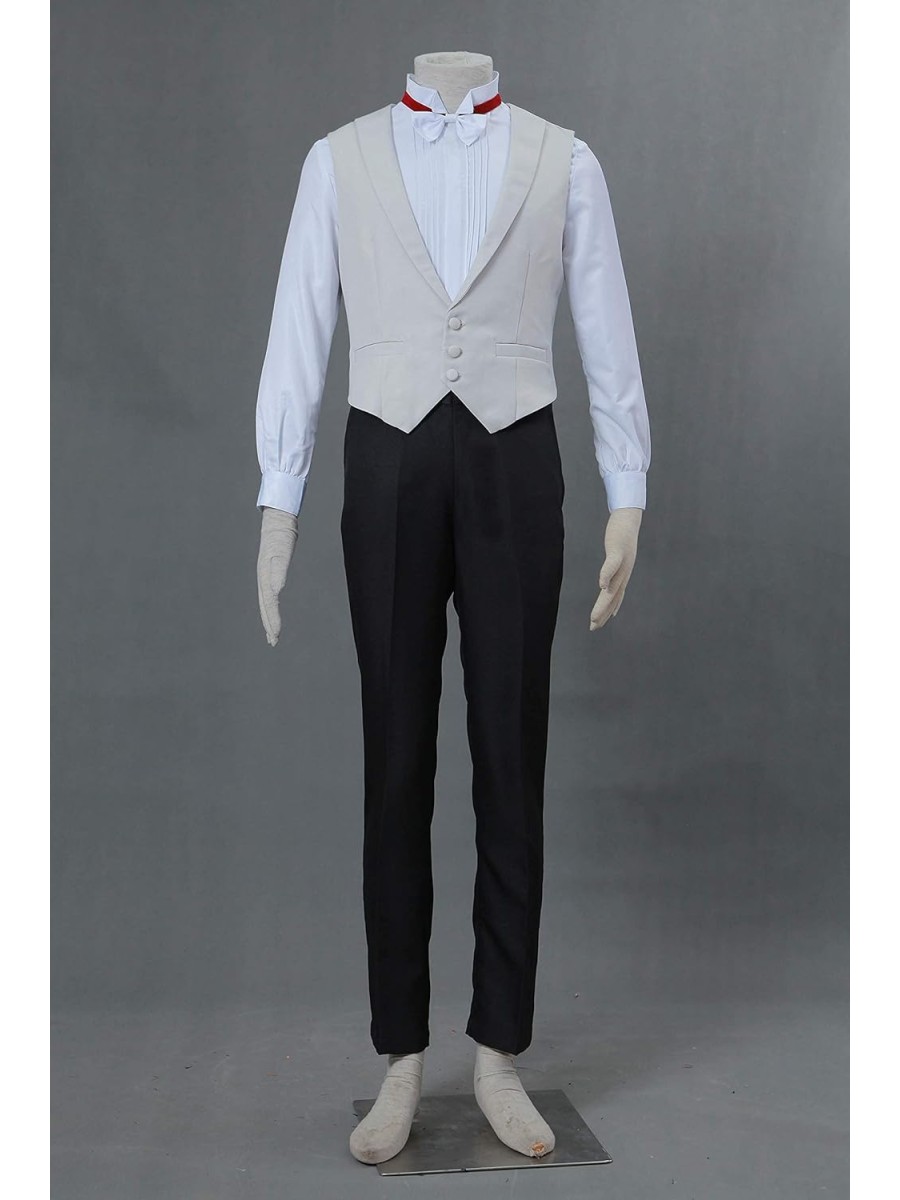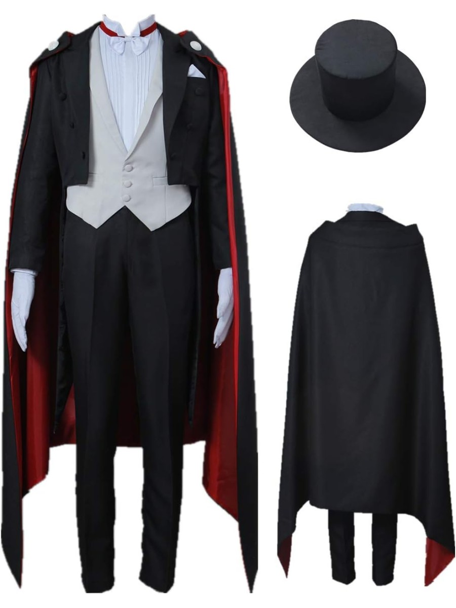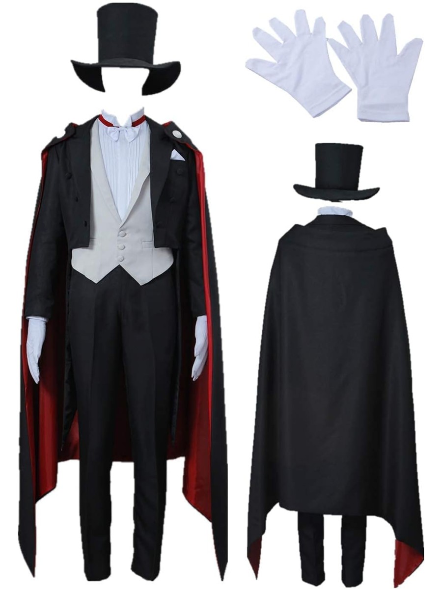 - 【Full set】Men's 9-piece suit: long cloak, tuxedo, vest, shirt, trousers, hat, tie, white breast pocket towel, white gloves X2