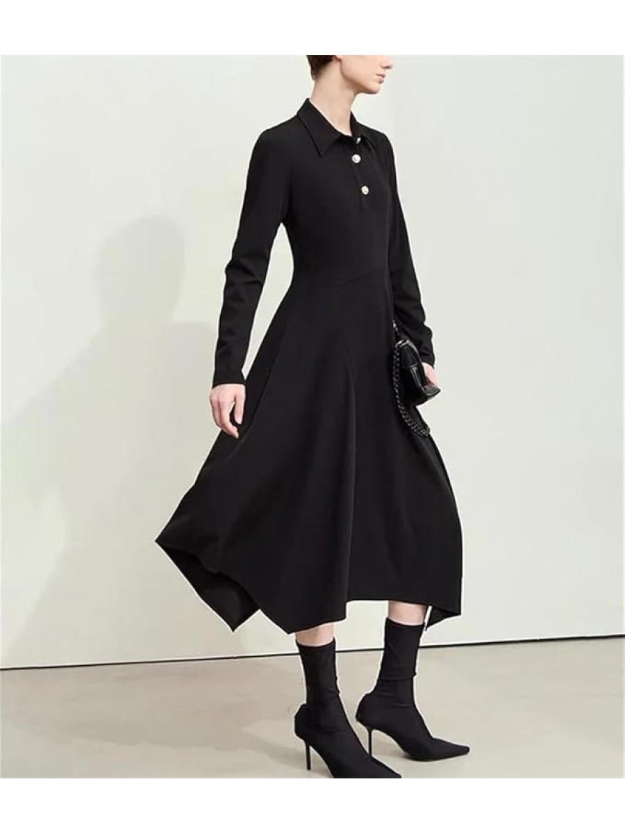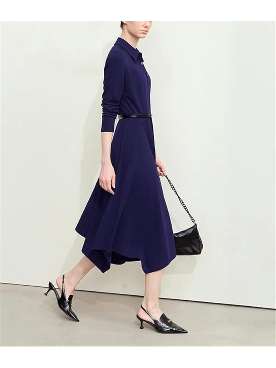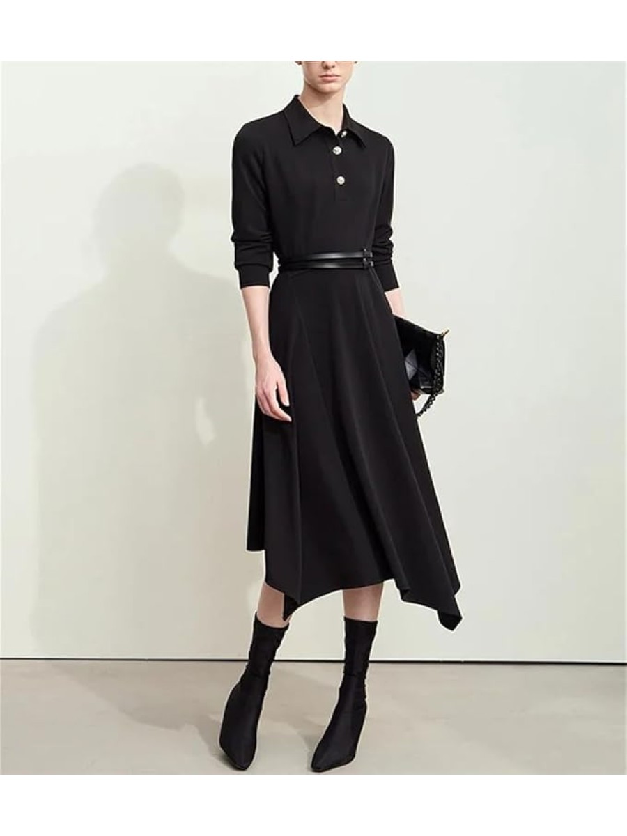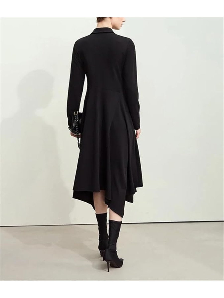 Women's Lapel Half Cardigan Dresses Irregular Hem Tunic Waist Long Elegant Office Dress